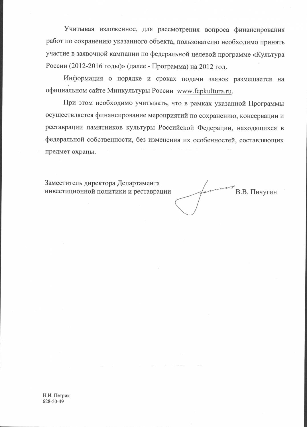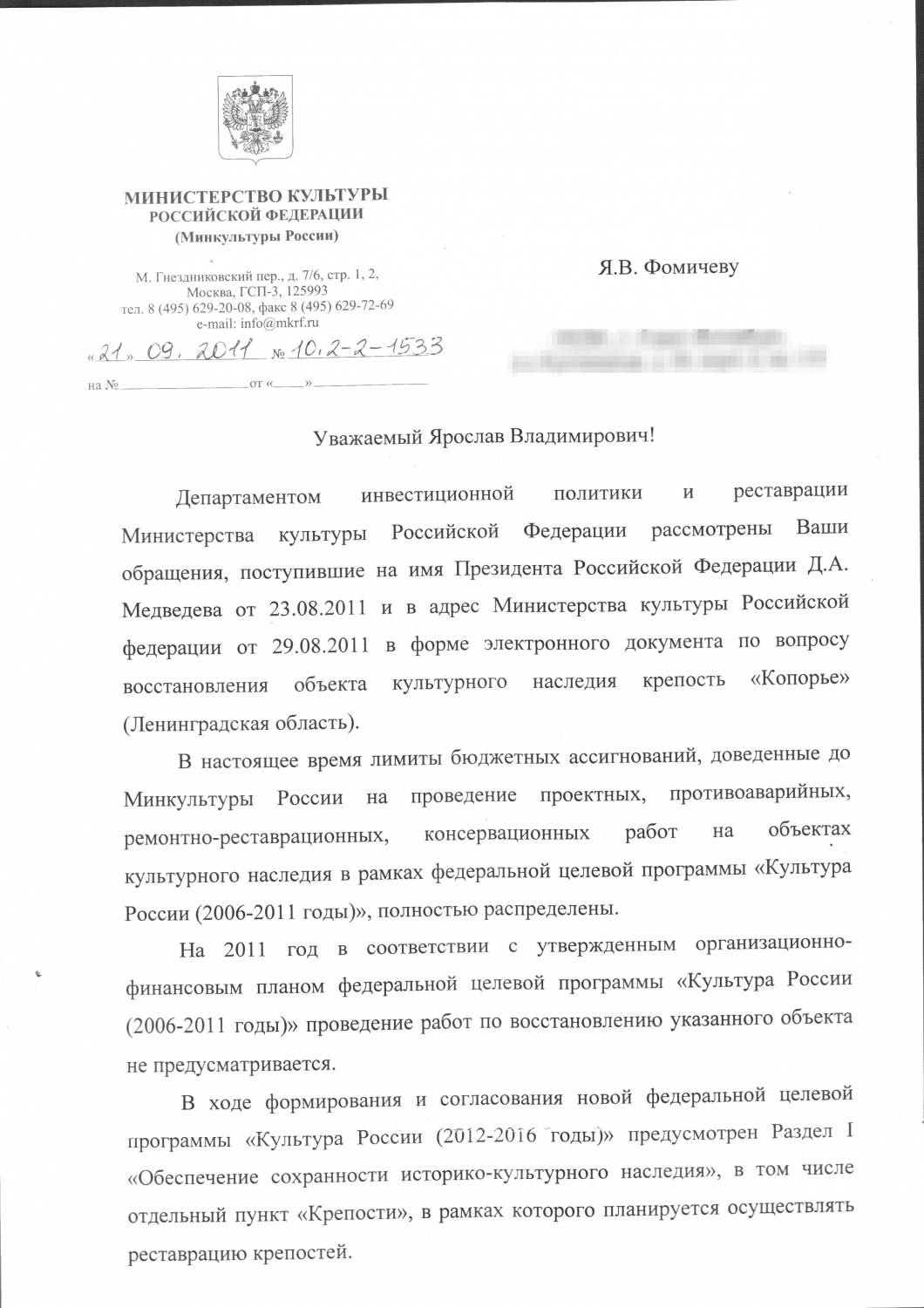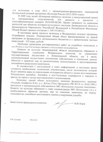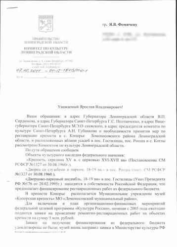действий группы.![]() ![]() В настоящее время группой совместно с директором музея " Копорская крепость " Дороженко Л. В. удалось организовать подачу заявки для включения крепости Копорье в программу по реставрации " Культура России 2012-2016 гг. ". Ждем ответа из министерства Культуры РФ ( март 2012 г. ). Комитет по культуре Ленинградской области ( "планируемые" действия в отношении крепости Копорье и усадеб Гостилицы, Ропша, Котлы от 07.10.2011 г. ). Необходимый документ для дальнейших действий группы. ![]() ![]() Постоянная комиссия по образованию, культуре и науки (ходотайство в адрес министерства культуры РФ с предложением включить крепость Копорье в программу по реставрации от 19.10.2011 г. ). Председатель Законодательного Собрания В. А. Тюльпанов поддержал наше обращение по крепости Копорье. ![]() |